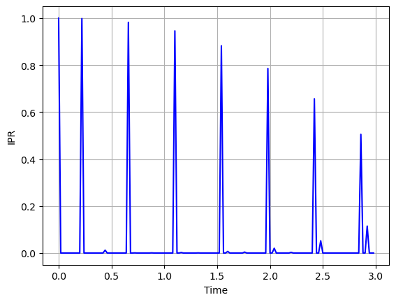 The figure shows the time evolution of the IPR after a quench from the MI regime to the SF phase. It can be seen that the initial MI phase vanishes over time but recurs later. The recurrence of a phase is also shown in the second Bose-Hubbard paper cited above, where they quenched from the SF phase into the MI phase in an experiment with cold atoms in an optical lattice.
